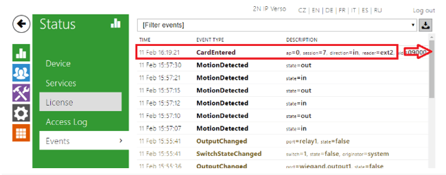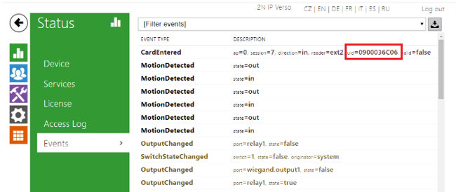 To add a new RFID card to the unit, you need to first find the ID of the card. Please put the card on the reader and then see the unit’s log in Status -> Events. You will see the event “CardEntered”, you need to see the “uid” parameter. Scroll to the right and copy it: