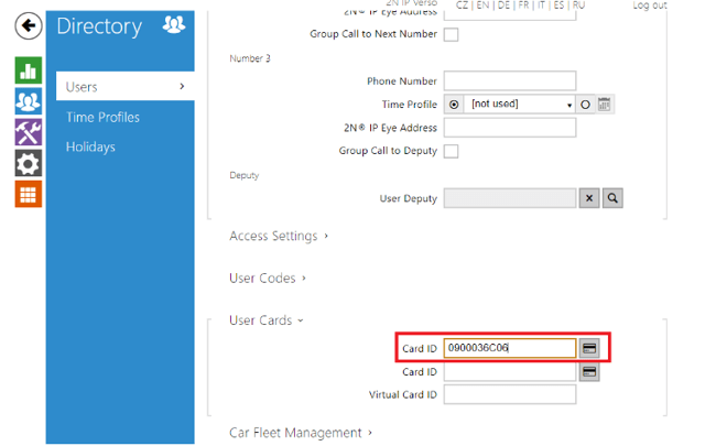 Saving a new RFID card’s ID can be also done with 2N USB RFID reader. A driver is needed for this device, more info is here. When the driver is installed, you can start scanning from the reader by clicking the button next to the field for Card ID.