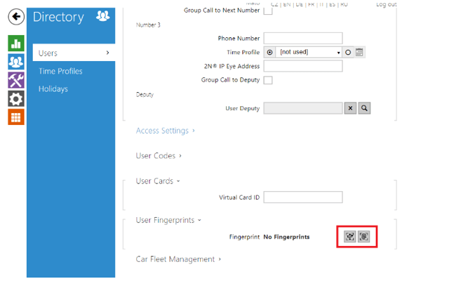 To setup a fingerprint access, go to Directory -> Users -> select User -> User Fingerprints -> click on one of the highlighted buttons. Left one is for assignment via 2N External Fingerprint reader. Right one is for assignment via reader module mounted on a unit: