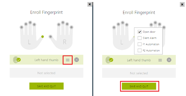 By default, Open door option is selected. Silent Alarm option is for triggering a silent alarm when this finger is scanned. F1 and F2 Automation option is for use in Automation scenarios. After you set the correct function, click Save and Quit.