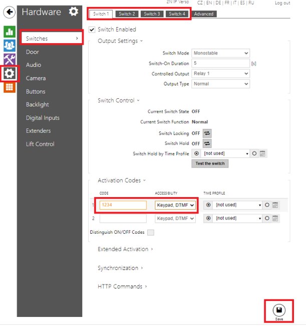 In this case, when the correct PIN is entered, unit will not show which User activated the switch, it will just show that the correct PIN was entered and the switch was activated. You can set this in Hardware -> Switches -> (for example) Switch 1 -> Activation Codes. You will also need to make sure that Keypad, DTMF or Keypad only option is active. After you enter the code, click Save: