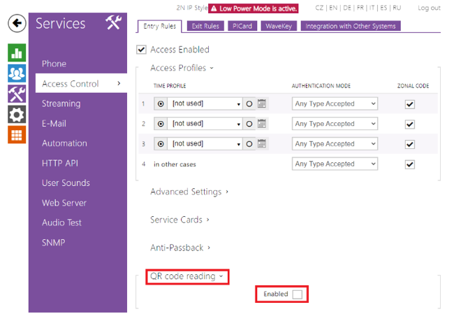 To be able to use QR codes for authentication, you need to first enable this function, you can do so in Services -> Access Control -> Entry rules -> QR code reading: