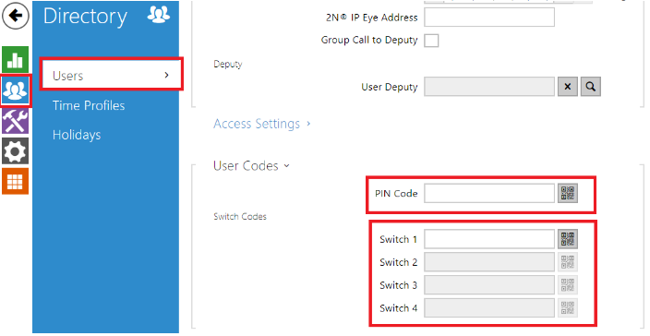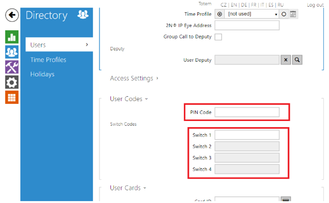 Switch codes – these codes are associated with respective Switch. User can control each Switch individually and those PIN codes are associated with this User only. The fields for codes here are greyed out if the respective Switch is not enabled. You can enable a Switch in Hardware -> Switches.