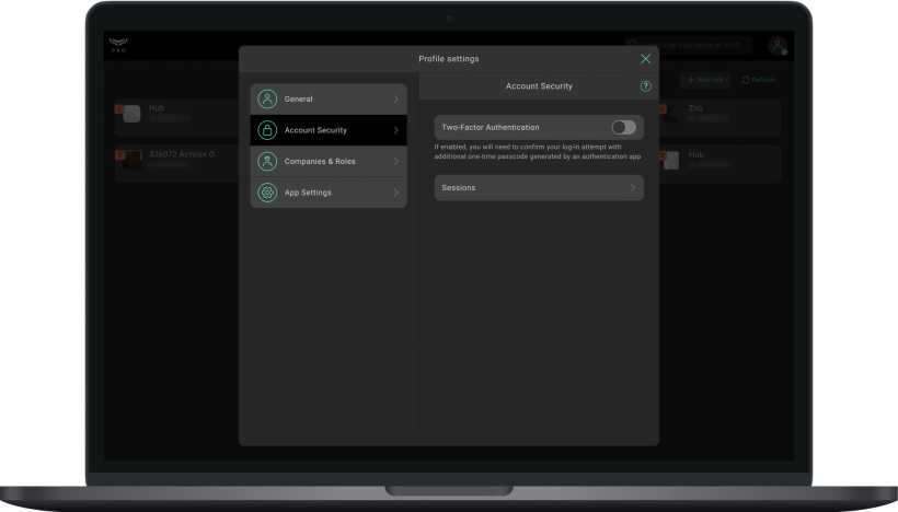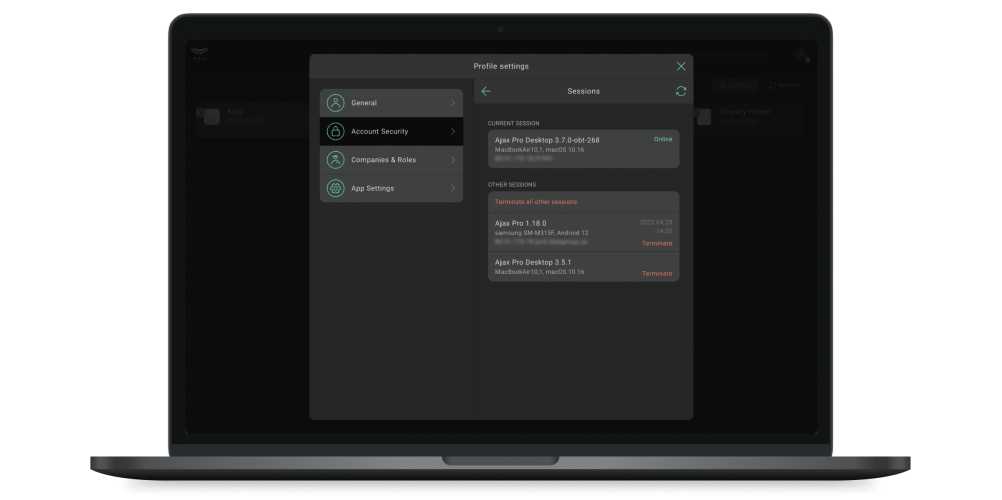 The session of the device from which you entered the app is called the Current session. Other sessions of devices from which the PRO account is logged in are available below. You can end a session by clicking Terminate, or Terminate all other sessions except the current one.