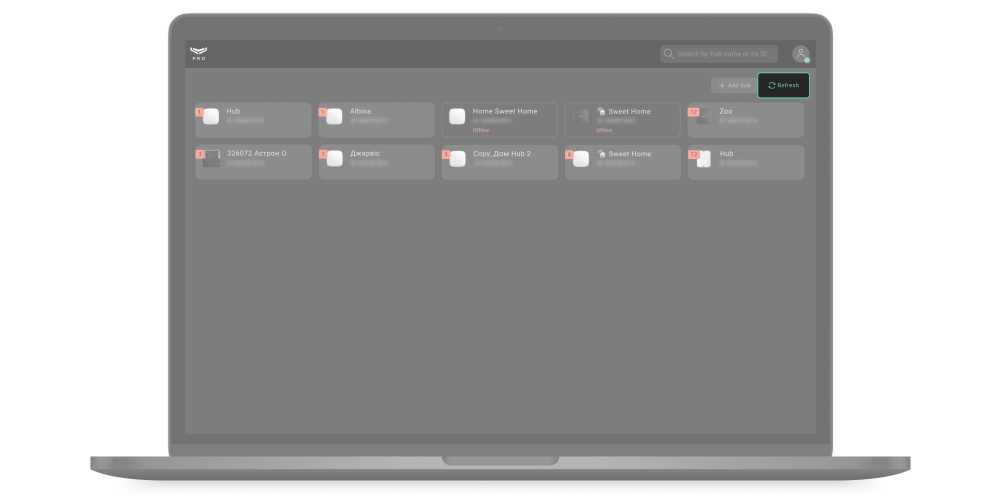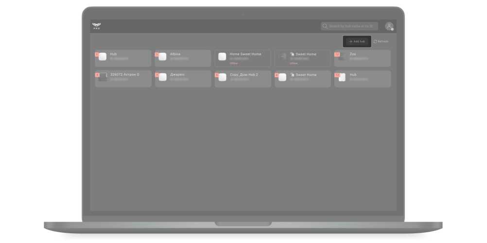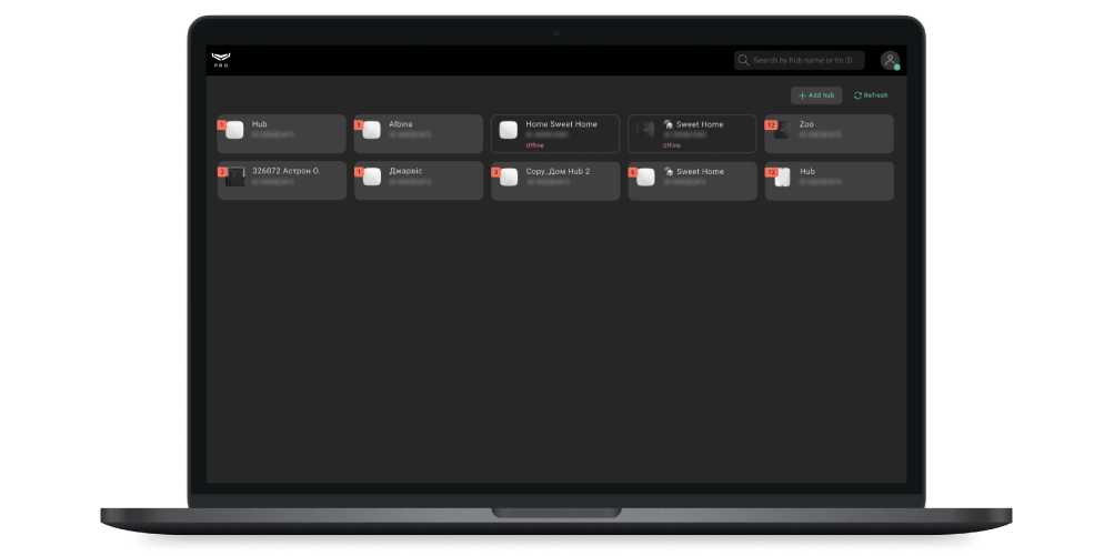 When you log in, a list of hubs linked to the PRO account opens. Hubs with which there is no connection are marked with a red caption Offline. The faults counter (red icon with a number) shows the total number of faults for a specific security system.