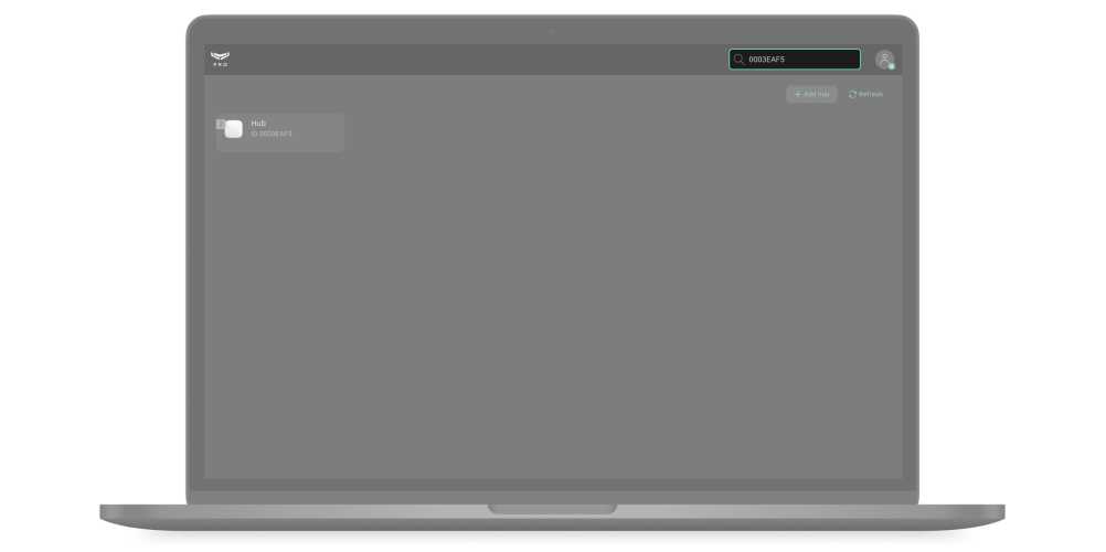 Finding the hub. The app has a search by name and by hub identifier (ID). Hubs are displayed as you type a text.