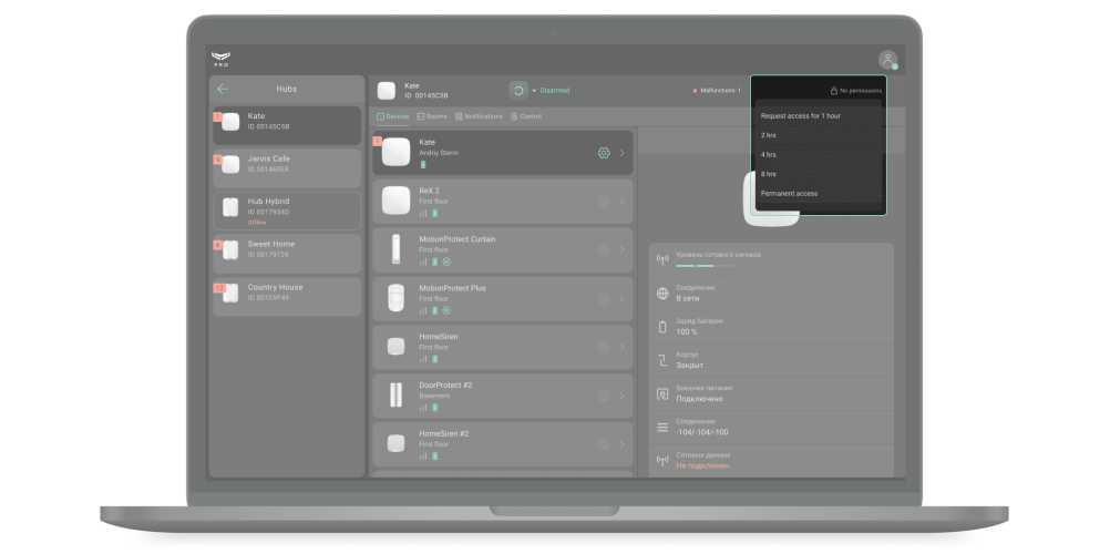 The PRO account can have temporary or permanent access to system settings. The field indicated in the screenshot shows the time during which the PRO account has access to the settings. Click on the field and select the required option to request temporary or permanent access. The request can be confirmed by the hub administrator or another PRO account with the right to configure the system.