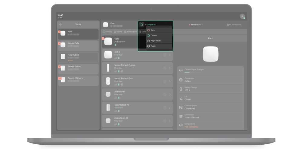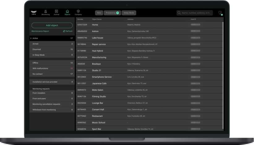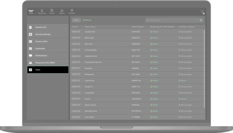 PRO Desktop can be used in parallel with the PRO mobile app. Installation and service companies can use the app to set up and connect security systems, while security and monitoring companies can use it to organize a Central Monitoring Station (CMS).