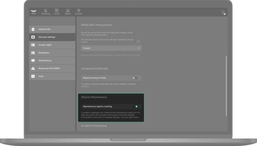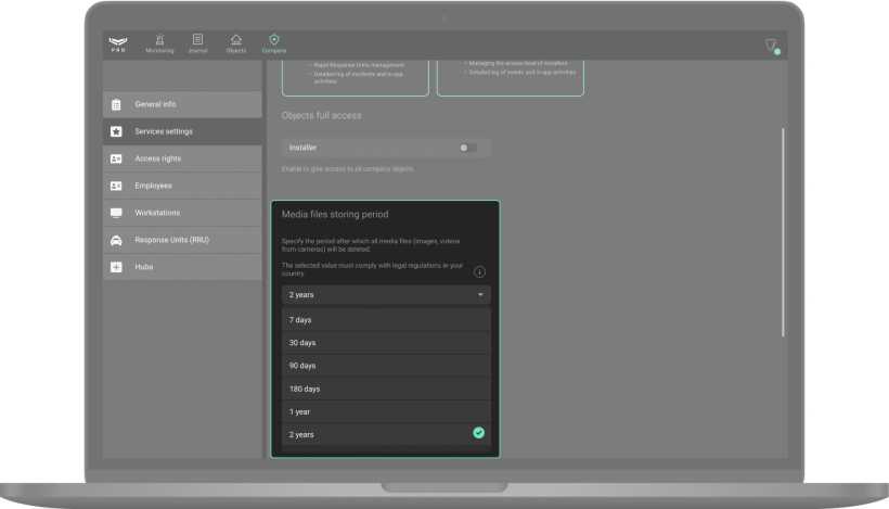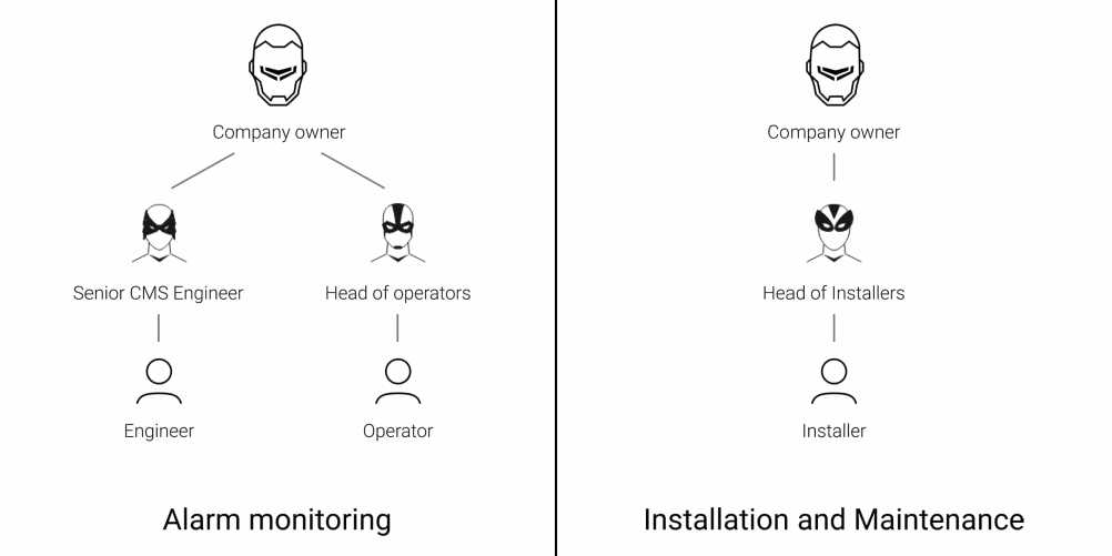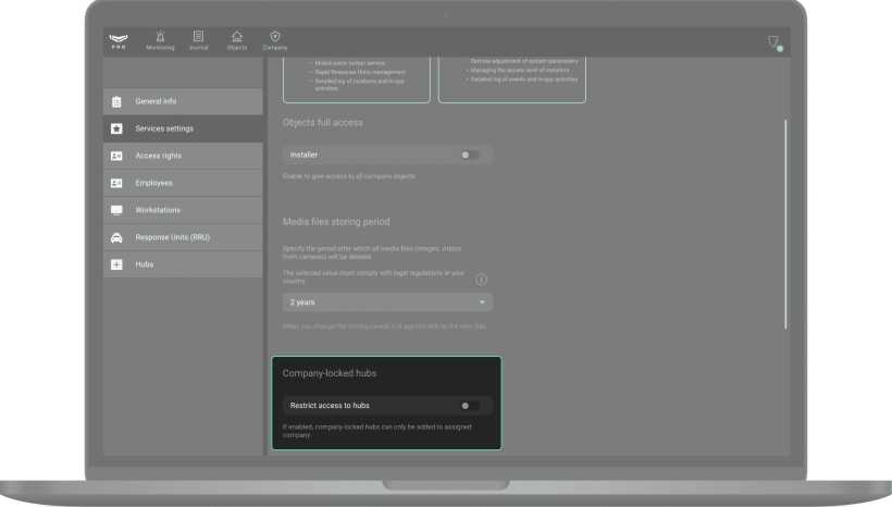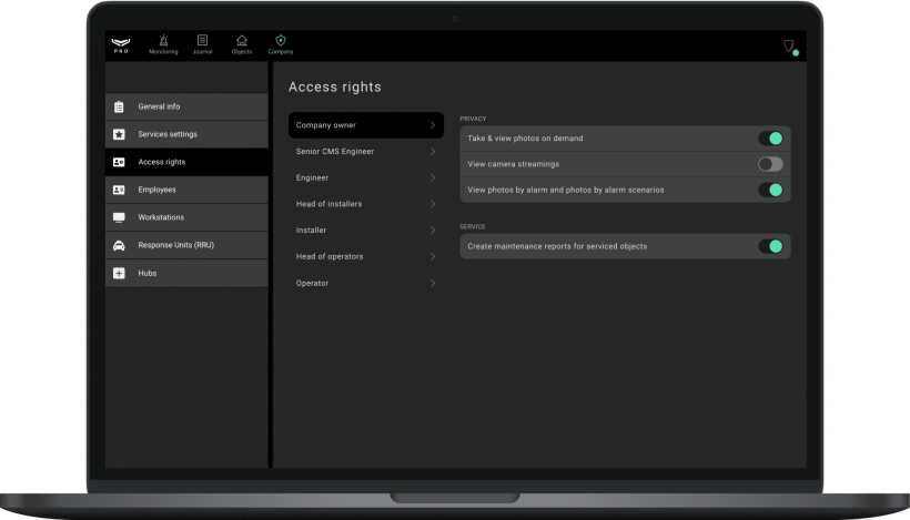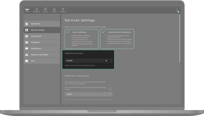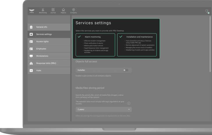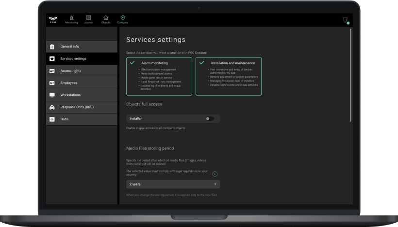 The set of functions is selected independently. The app also allows you to select both types of services at once: Alarm monitoring and Installation and maintenance. This is provided for companies that simultaneously install security systems and respond to their alarms and events.