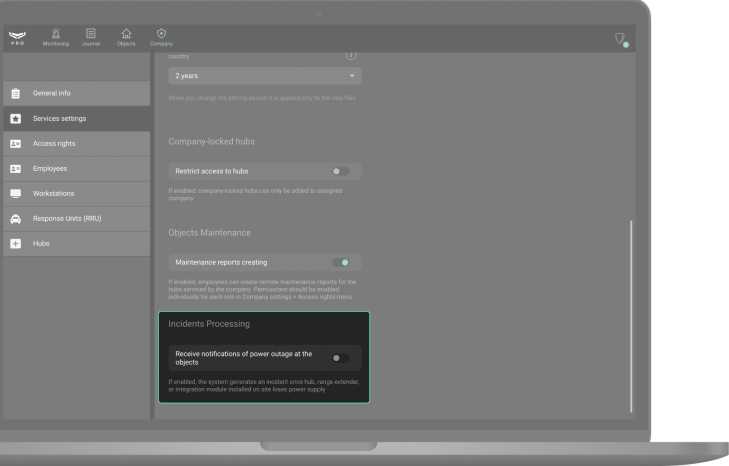 Notification of power outage at the object can be disabled in the Services settings menu in the Company module.
