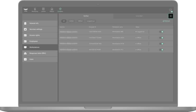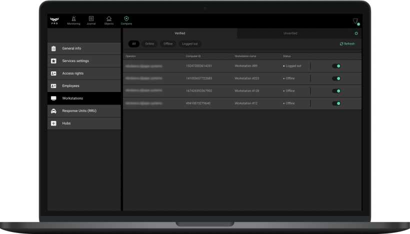 Separately, the list shows incidents of loss of connection with the operator and operator logins to the PRO account from an unverified computer. These types of incidents are generated according to the operators’ workstations, which are confirmed in the Company module, processed as security alarms, indicating the cause of the incident, and recorded in the journal.