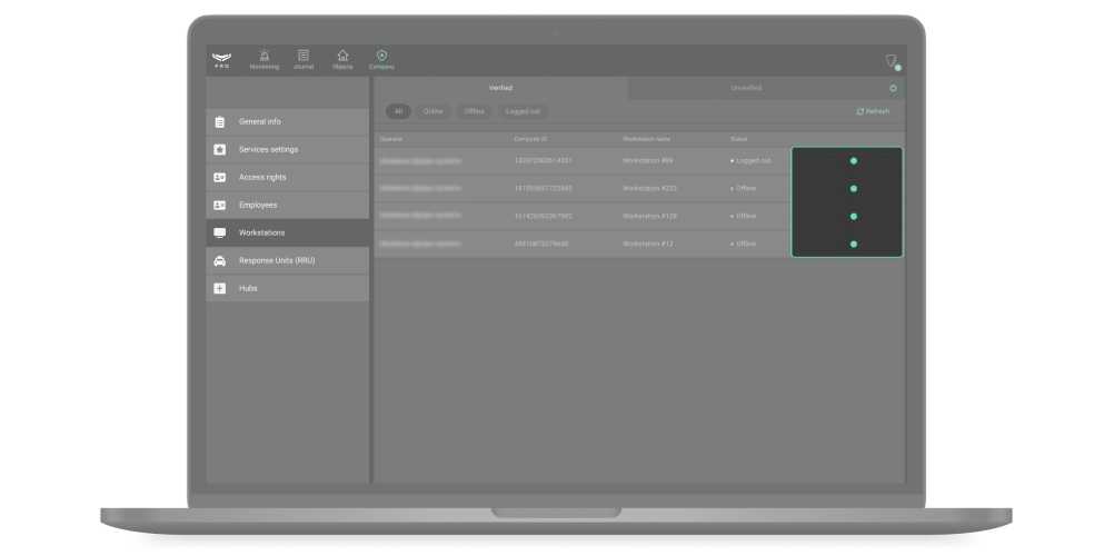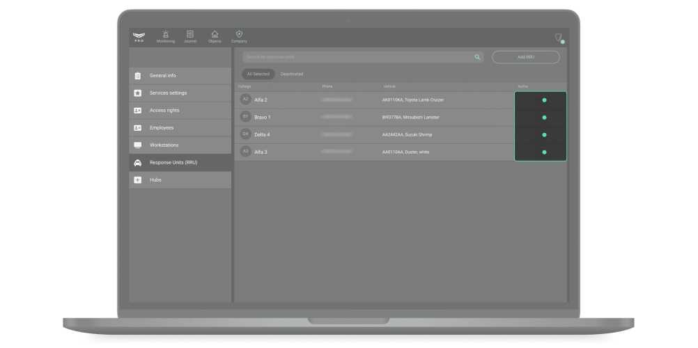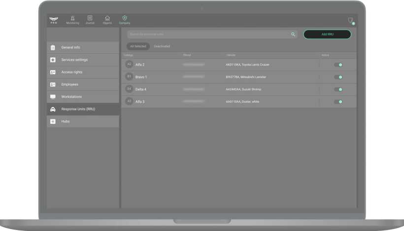 A company account combines all security objects, employee accounts, and teams of rapid response units (RRU) in one interface.