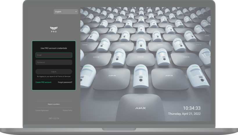 To log in to PRO Desktop, you need the PRO account. The account should be registered in any of these two apps: PRO Desktop or Ajax PRO: Tool for Engineers. You can’t log in to the PRO app with a username and password from the Ajax Security System app for end users. PRO account is different from the account created in the end-user app.