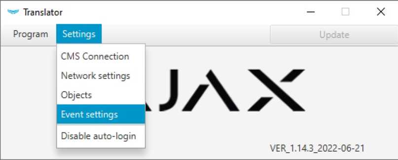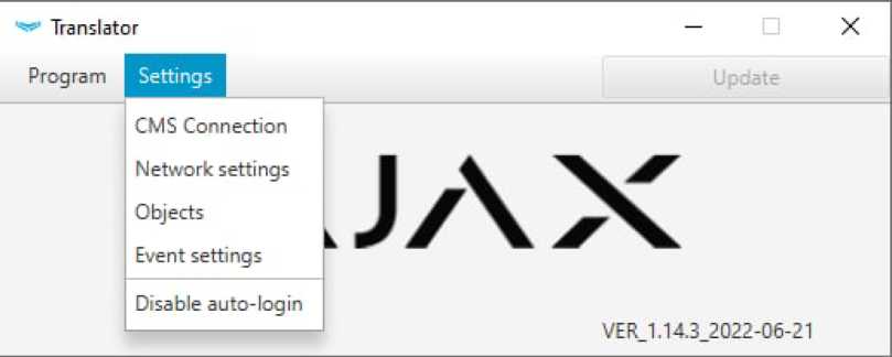 Ajax Translator User manual, Ajax Translator is an app to establish communication between Ajax security systems and third-party monitoring software. Acting as a link between the hub and the Central Monitoring Station (CMS), Ajax Translator converts the notifications received from the hub into event protocol supported by the CMS software.
