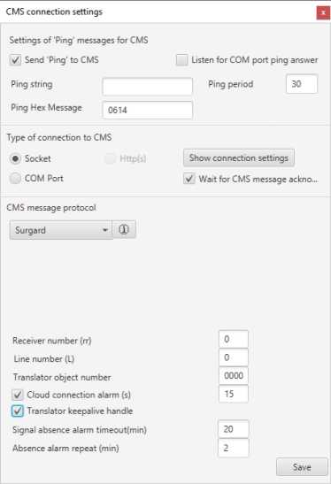 Ajax Translator transmits messages through the event receiver of the Central Monitoring Station. You can configure communication with the CMS receiver via TCP/IP or via virtual/physical COM port.