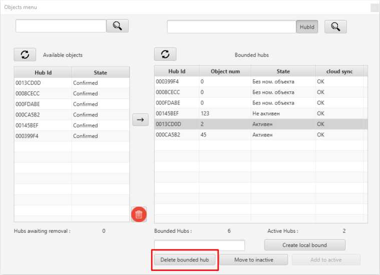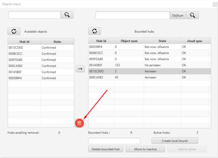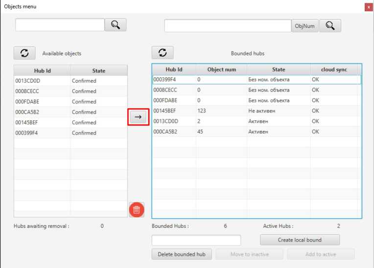To bind the hub to the CMS object number, highlight the hub ID in the table on the left and press the arrow button. The hub will be added to the table on the right with console number 0.