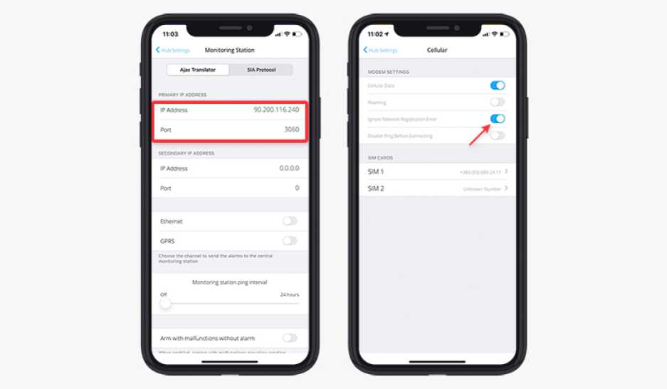 After configuring the connection from the CMS side, go to the Monitoring Station menu in the hub settings in the Ajax app. Indicate the IP address and the number of the forwarded external TCP port. Select the communication channels through which the hub will connect to your server: Ethernet and/or GPRS.