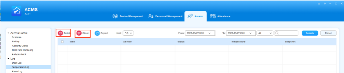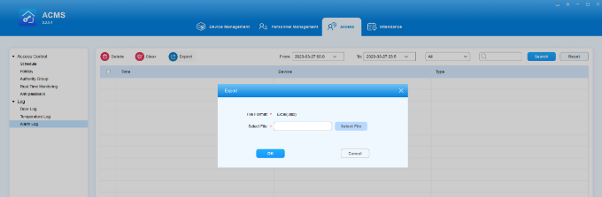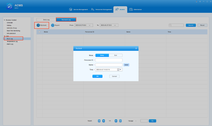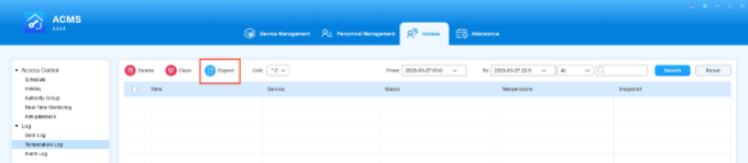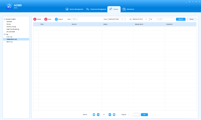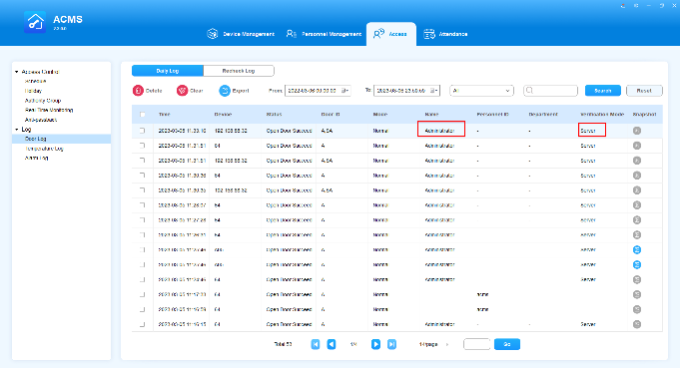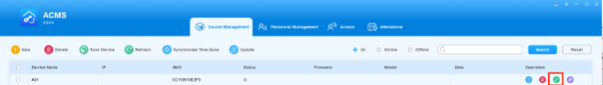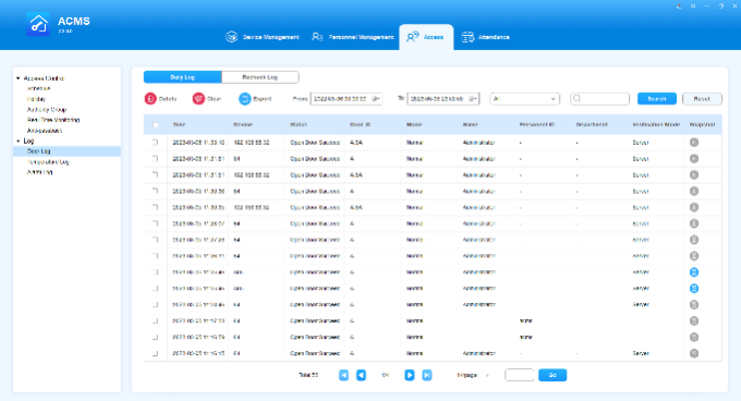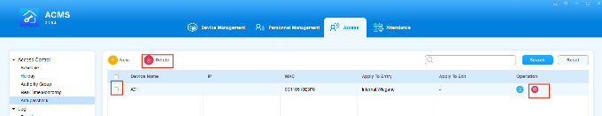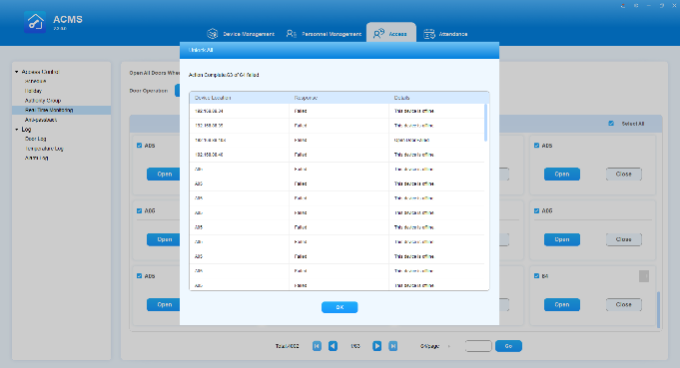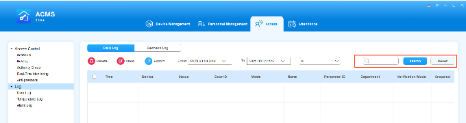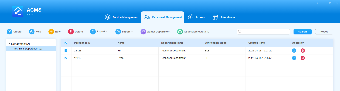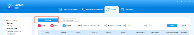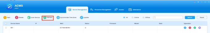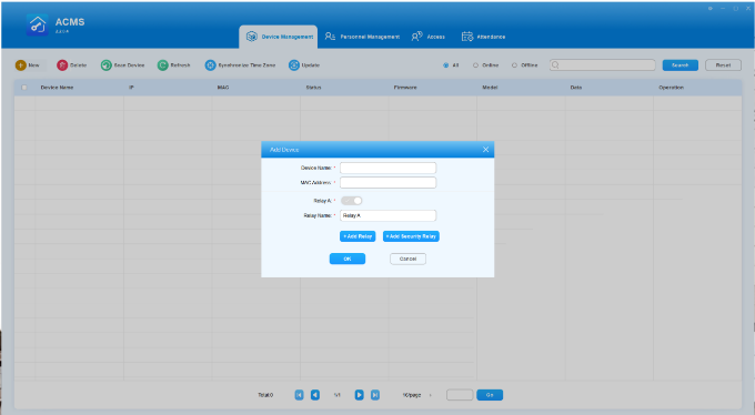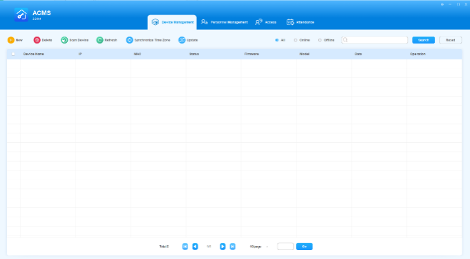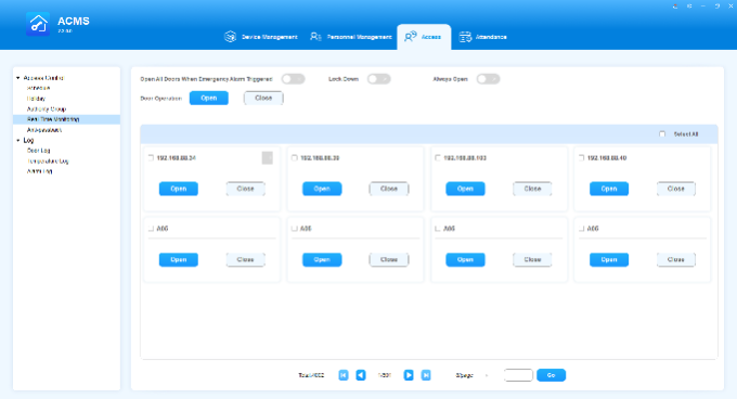 ACMS main interface mainly consists of four modules, namely the Device Management module, Personnel Management module, Access module, and Attendance module.