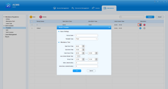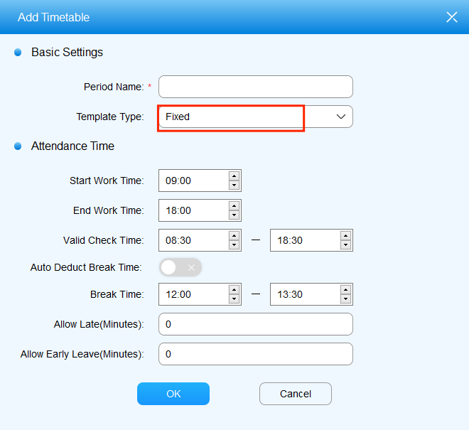 | 5 | Valid Check Time | Set up a valid punch-in time range for Fixed timetable. The default valid punch-in time range is from 08:30-18:30. If an employee clocked multiple times, the earliest recorded time will be considered the clock-in time and the latest will be considered the clock-out time. |