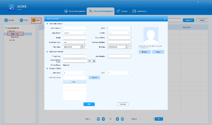 You can add personnel in the designated department in which you enter the personnel information such as personnel name, ID, photo, etc. While assigning the personnel with the PIN code and card number for the door access.