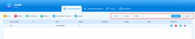 The device search can be done by first filtering the device status as indicated by All, Online, and Offline before entering the search information for the targeted device search.