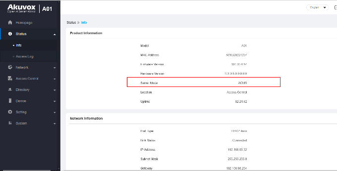 When a device is in self-configuration mode and is added to ACMS, it will automatically switch to ACMS mode. This mode can be confirmed by accessing the device web interface and going to Status > Info > Product Information.