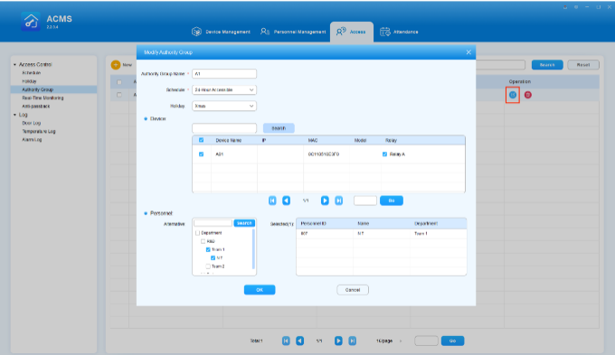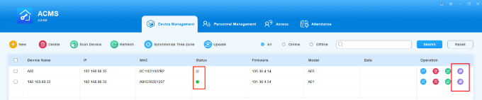 If you make any changes to on the Personnel or Authority Group screens, you need to go to the Device Management page, select the relevant devices, and click