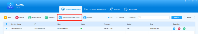 In the device management module, you can manage the device in terms of adding, editing, deleting the device(s) individually or in batch, and synchronizing the time zone to the corresponding device(s) you selected. You can also search the data.