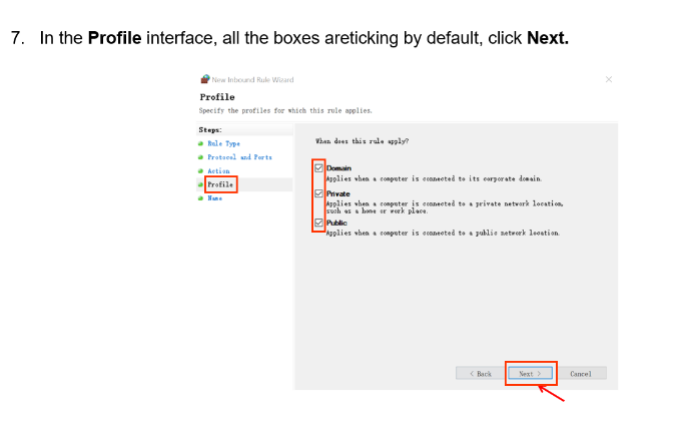 If the Firewall is not turned off, please add the following ports to the whitelist.