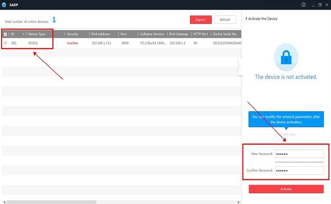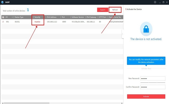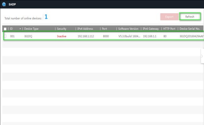 5. Run the software SADP tool and click refresh. It will find the camera’s IP, and its status is Inactive.