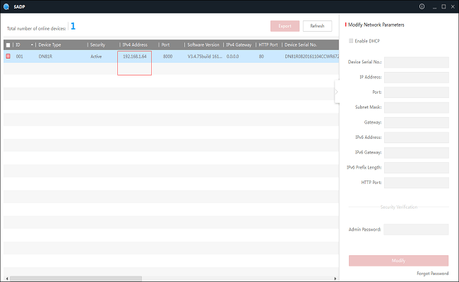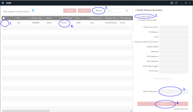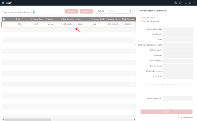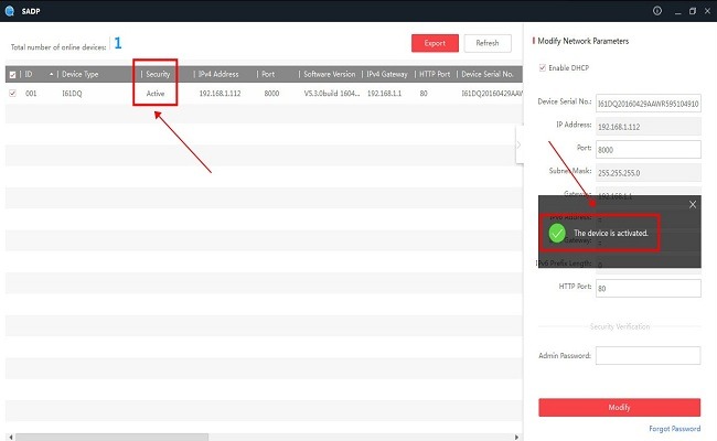 The SADP will detect the camera’s IP address. Follow the below picture to enable DHCP for the camera.