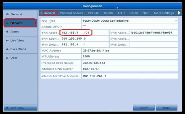 Go to Configuration-Network-Basic Settings-TCP/IP, Uncheck DHCP, fill in the below box per your computer in the same network.
