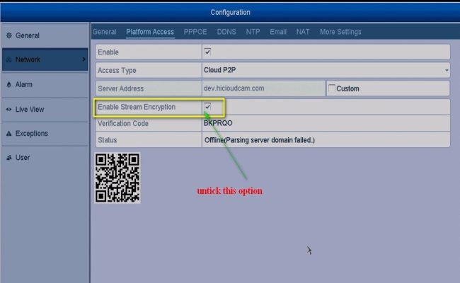 After the above, go to Configuration-Network-Advance Settings-Platform Access, make sure the option Enable is checked and Register Status shows Online as below picture.