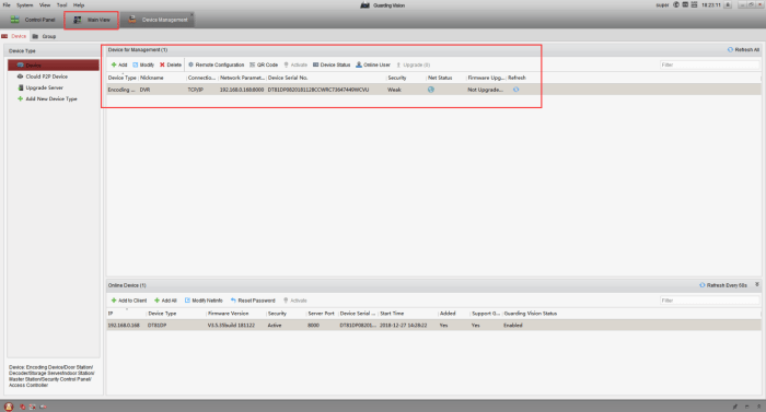 7. The device information will then be shown on the tab page Device for Management. You can see the Net Status is online as the picture shows.