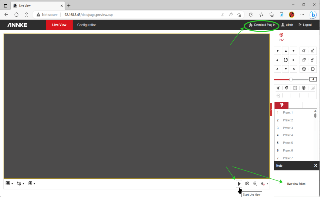 If you find the camera live view fail to load when clicking the button “Start Live View “on the webpage, please try the below solutions: