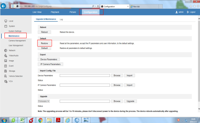 2. After you enter the DVR/NVR on the computer browser, please go to Configuration>Maintenance>Upgrade&Maintenance>Restore.