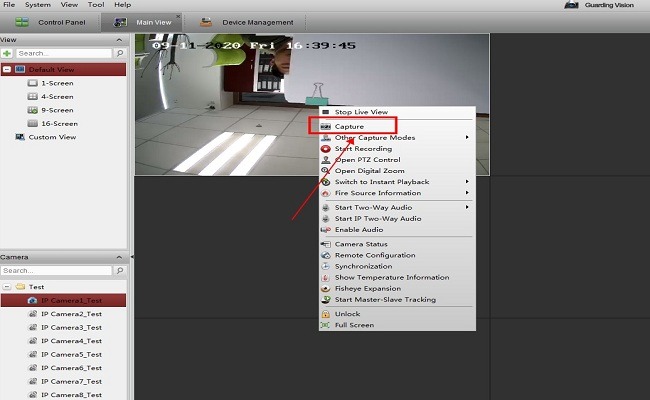 On Guarding Vision, please select the camera and right-click the mouse, and then click Capture: