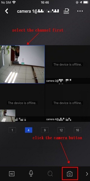 On the phone APP, please preview the cameras, and then select the camera button to take a screenshot for the camera: