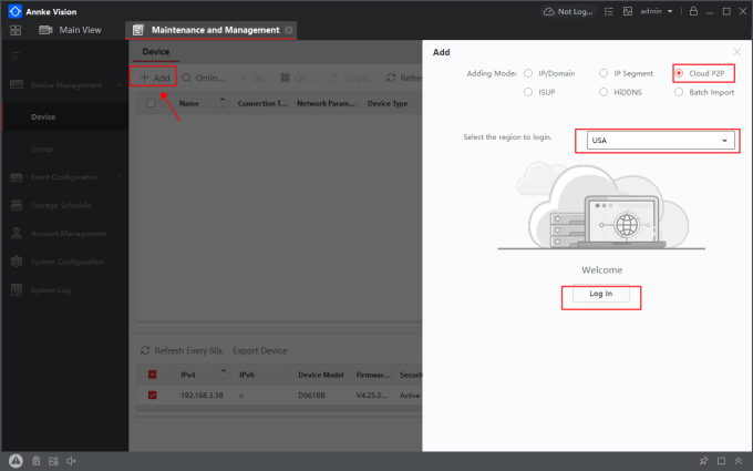 5. Come back to ANNKE Vision. Go to Device Management and click Add. Choose Cloud P2P and select your country/area(the phone APP account area), and click Login.