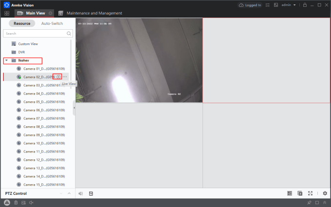 8. Go to the Main View tab page, click on the folder under the Camera list to expand the camera channels. Double-click on the channels to see the live streaming.