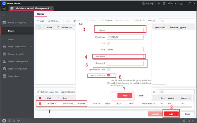 7. Select your device, and click on Add. Then please fill in the information in the popped window.