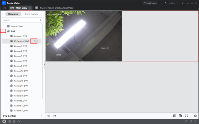 9. Go to the Main View tab page, and click on the folder under the DVR list to expand the camera channels. Click the play button on the channels to see the live streaming.