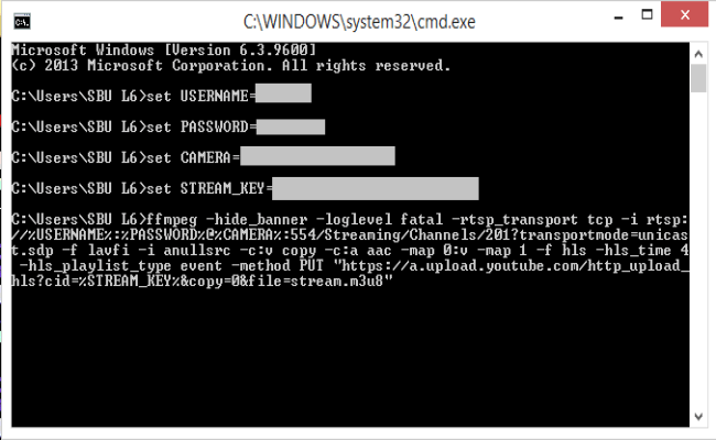 ffmpeg -hide_banner -loglevel fatal -rtsp_transport tcp -i rtsp://%USERNAME%:%PASSWORD%@%CAMERA%:554/ Streaming/Channes/ID/?transportmode=unicast.sdp -f lavfi -i anullsrc -c:v copy -c:a aac -map 0:v -map 1 -f hls -hls_time 4 -hls_playlist_type event -method PUT “https://a.upload.youtube.com /http_upload_hls?cid=%STREAM_KEY%©=0&file=stream.m3u8”