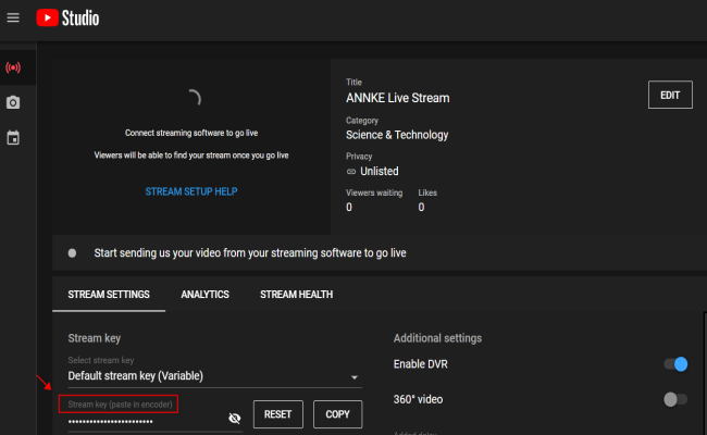3). Get the YouTube stream key: Once your YouTube account has access to YouTube Live, you can find the stream key as the below picture shows.