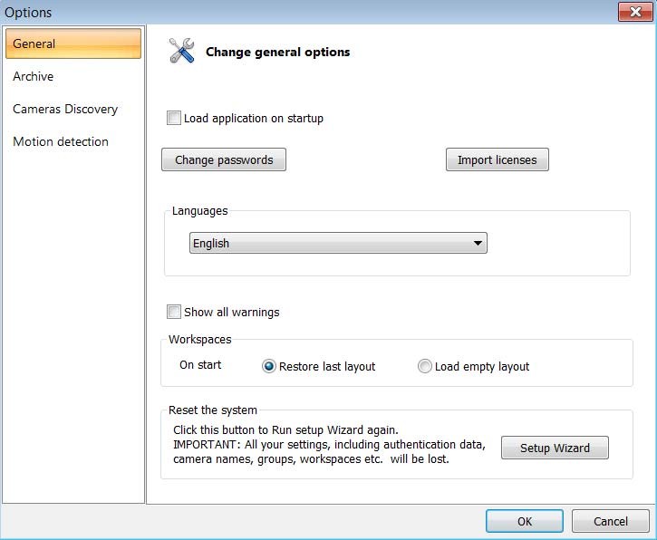 The Workspaces options determine the behavior of the Live View Window the next time the program is launched. If Restore Last Layout is selected, the last Live View Window configuration that is open when the application is closed will be displayed the next time it is logged into again. If the Load Empty Layout option is selected the application will always start with a blank Live View Window on log in.