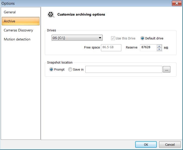 The storage will be cascaded starting with the default drive location to any additional drives selected in a First In, First Out (FIFO) method. When a drive is selected from the dropdown menu, the Free Space field will display available storage space on the drive. The Reserve function will allow setting a reserved storage quota size within the available storage on that drive. The reserve storage size configured will be kept as guaranteed available storage area for recording and will not be available to other applications for any other purpose. Note: Windows Explorer may display less free space than is actually available on the selected hard drive.