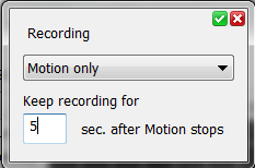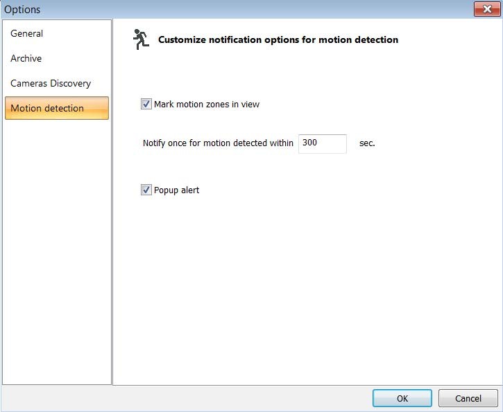 Mark Motion Zones in View option will display areas of motion activity in the image with green highlights on the live image when Show Motion Detection function button is active in an individual camera viewing window. The option to Notify Once for Motion Detected Within specifies the duration between notifications of motion events. The option Pop‐up Alert when selected (default setting) will allow a pop‐up message to appear in the lower right corner of the screen with camera name notifying a motion event was detected.
