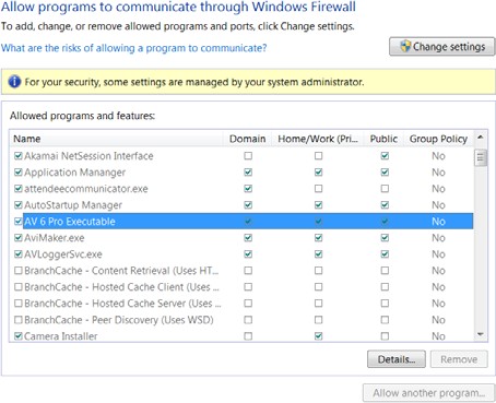 exceptions are made for the following applications in the Windows® firewall or other firewall software installed on the computer. Exceptions should be made for AV6Pro.exe which can be found in the Applications folder.