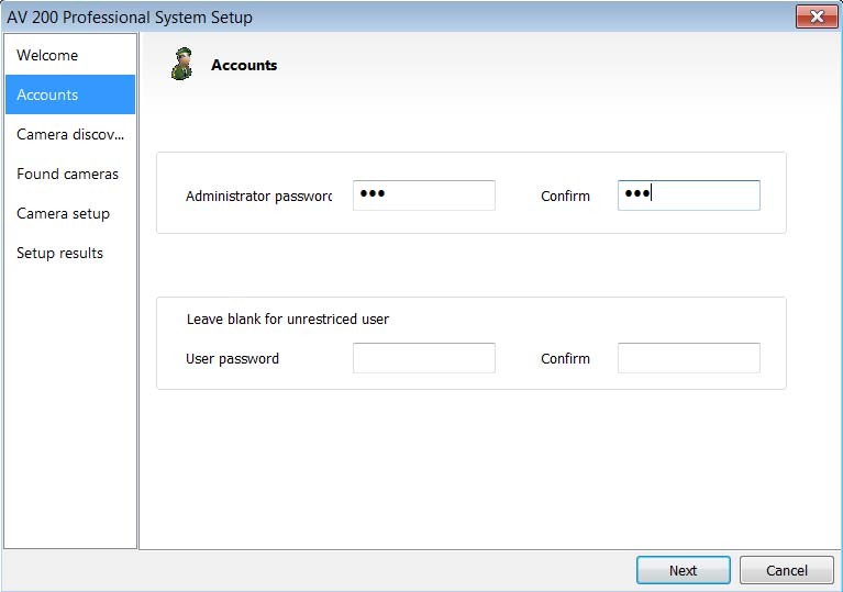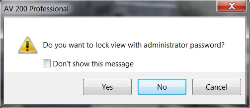 Passwords can be changed and set for the Administrator and User accounts. There are only two security levels in the AV200 software: