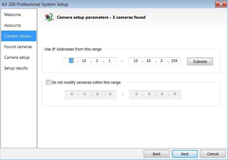 A range of IP addresses can be defined to apply to the cameras. If unchanged, the default address range will be defined by the IP address currently assigned to the computer. The second IP range means cameras within this range will be not selected by default. No changes will be made to any cameras not selected (see next wizard page).